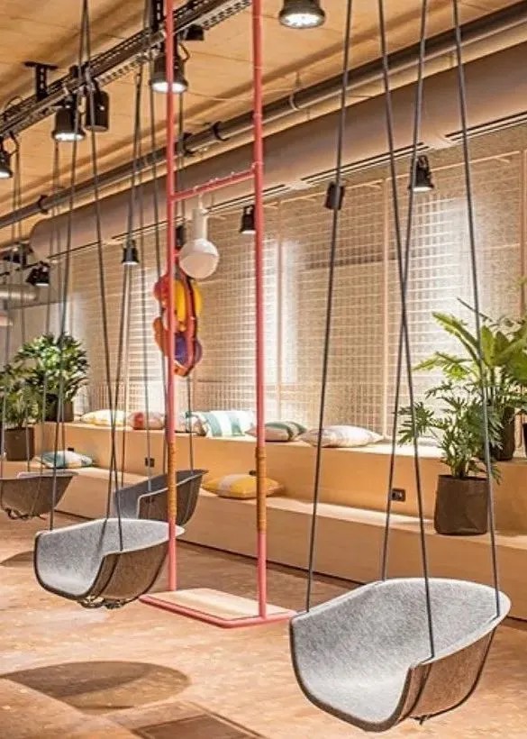空間以明亮的粉彩和摩登風格將顧客帶入加利福尼亞的風情世界,還通過一系列不同尋常的材料組合,為顧客提供不一樣觸覺、視覺體驗的潮酷餐飲空間。顧客可以選擇坐在落地窗前邊品嘗美食,邊欣賞對面動物園的猴山;也可以選擇以鳥籠為靈感設(shè)計的沙發(fā)區(qū),或是以階梯座的秋千林立的休閑區(qū)等。