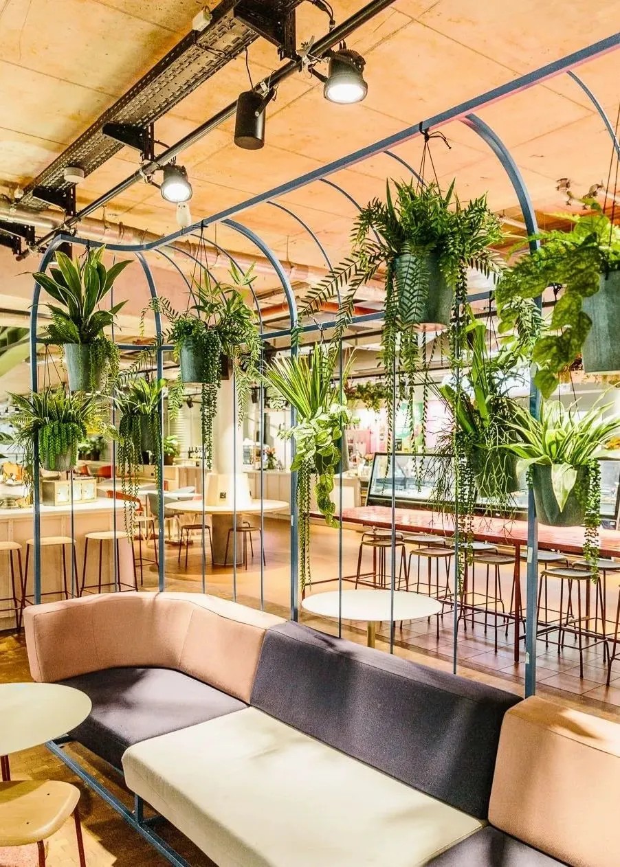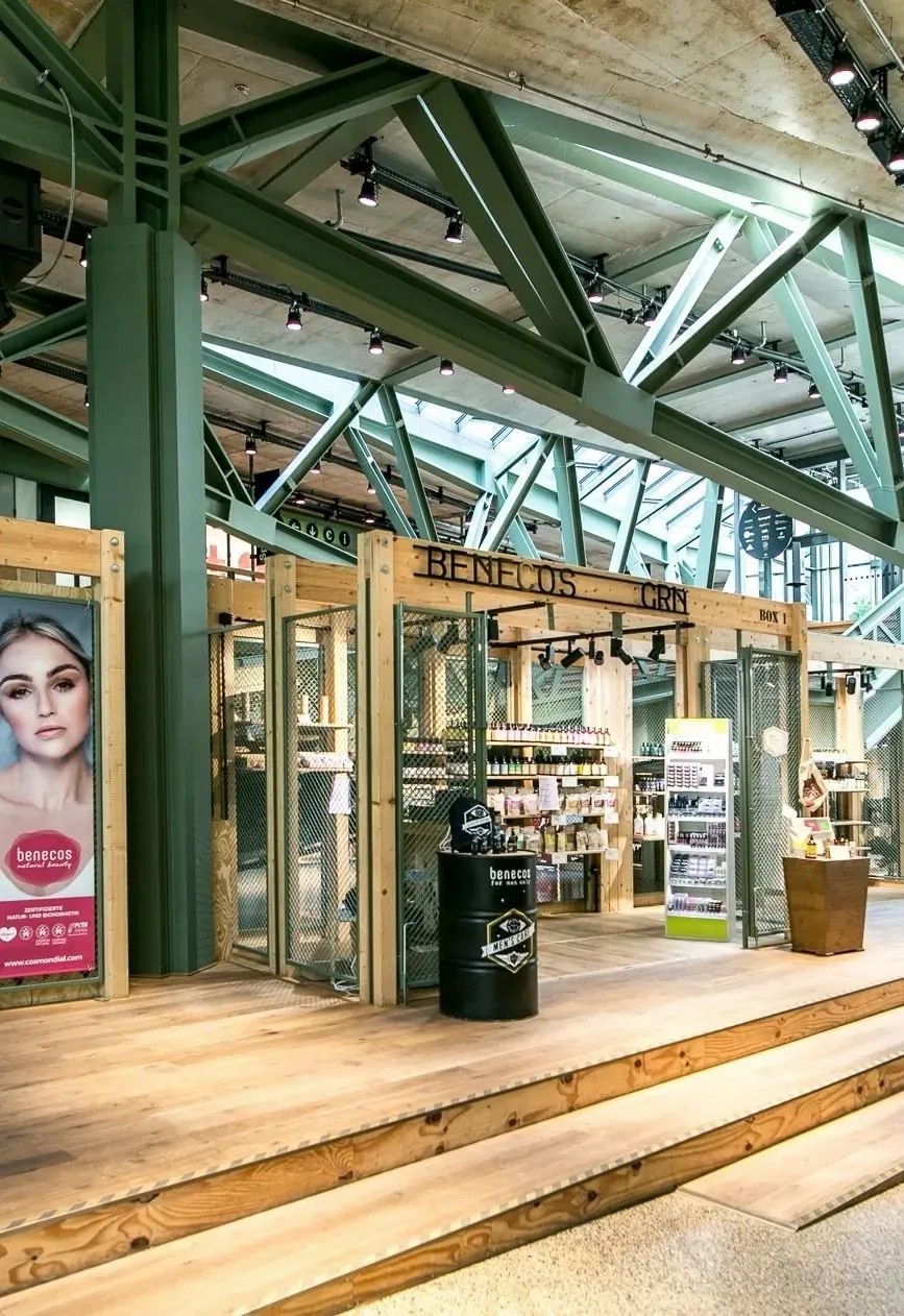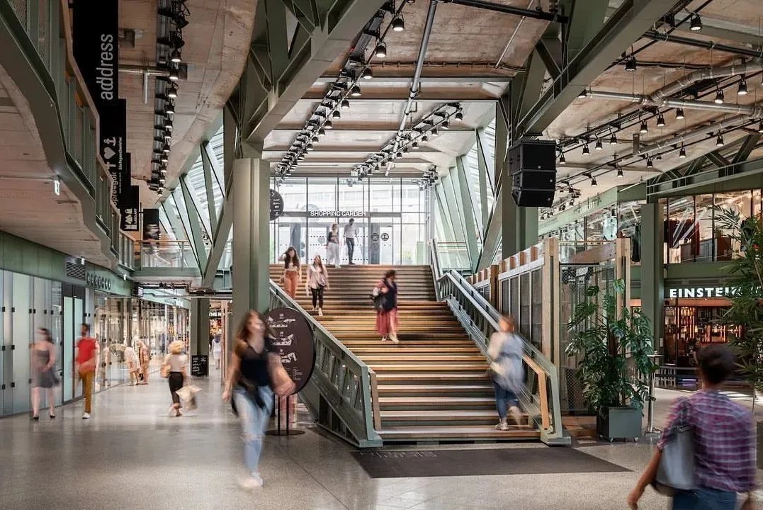 在商業(yè)的二層則設(shè)置了一個開放、通透的公共空間,同柏林潮流酒店25小時(Twenty five hours hotel)進行聯(lián)通。并以城市綠洲為設(shè)計概念,在頂層設(shè)計了一個布滿植物盆栽的七千平方公尺的天臺,供給顧客休憩社交,營造自由、無拘束的商業(yè)氛圍,與項目的整體定位相得益彰。