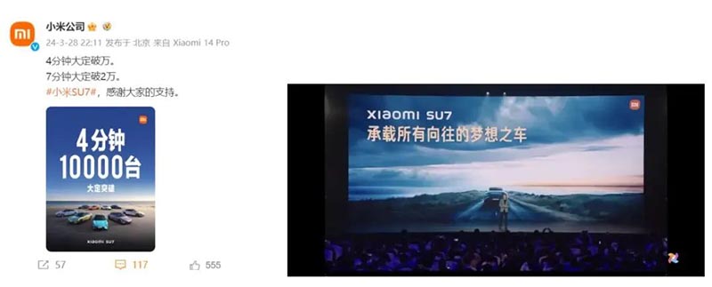 更令人矚目的是,新車在發(fā)布后僅4分鐘內(nèi)便突破萬輛大定,7分鐘內(nèi)更是飆升至2萬,上市短短27分鐘便鎖定了5萬臺訂單,完美詮釋了“上市即熱銷”的盛況,小米汽車也因此被賦予了繼特斯拉之后“新鲇魚”的稱號,SU7更是成為了2024年汽車界萬眾矚目的焦點。