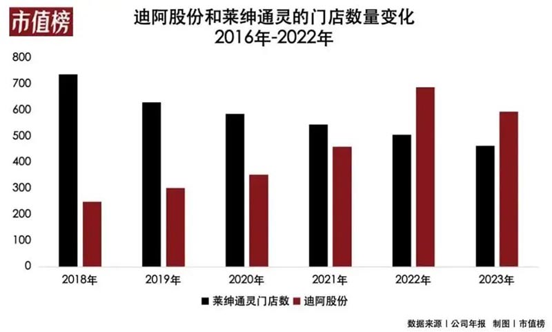 迪阿股份(股票代碼:301177),作為首飾市場中的一員,在“黃金熱潮”的沖擊下,已連續(xù)六個季度面臨營業(yè)收入與凈利潤的“雙重下滑”。2023年,其門店數(shù)量更是縮減了94家,降至594家,而萊紳通靈亦不例外,門店數(shù)量減少了44家,目前總數(shù)為463家。
