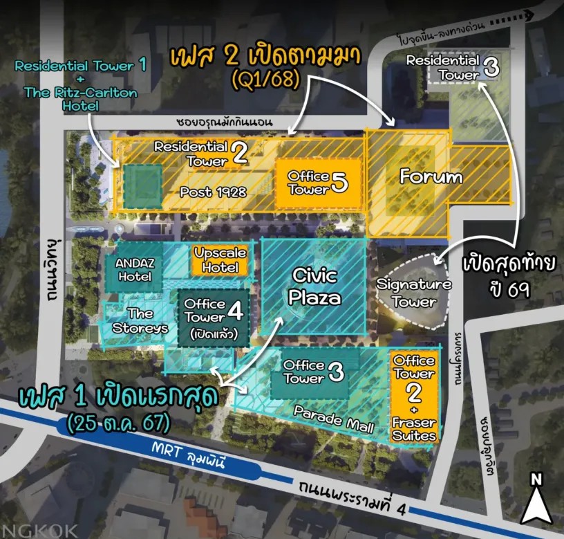 辦公樓方面,現(xiàn)階段3號(hào)塔、4號(hào)塔和5號(hào)塔已經(jīng)陸續(xù)投入使用,包括律師事務(wù)所Baker & McKenzie Ltd.、雅詩(shī)蘭黛集團(tuán)、寶馬集團(tuán)、KGI Securities、Menarini、LINE MAN Wongnai等跨國(guó)公司都已選擇將辦公地點(diǎn)遷至于此。