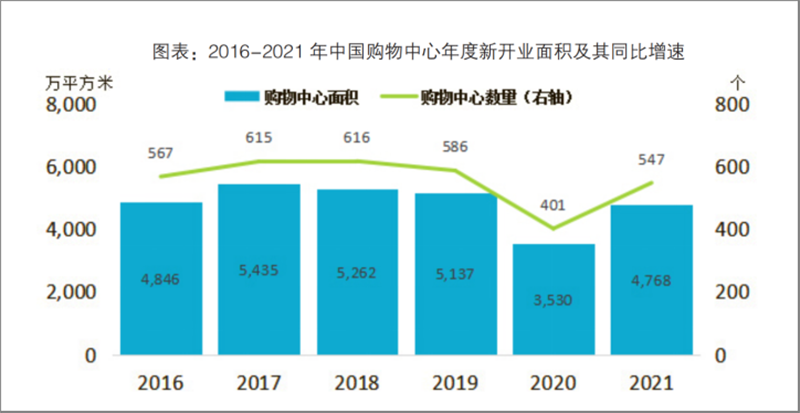 《白皮書》在“2021年中國零售市場最新發(fā)展”部分指出,2021年,中國實現(xiàn)GDP(國內(nèi)生產(chǎn)總值)114.4萬億元,穩(wěn)居全球第二大經(jīng)濟體,全年社會消費品零售總額達到44.1萬億元,同比增長12.5%。同時,中國在運營購物中心數(shù)量達到6387個,總面積達到4.75億平方米。其中,2021年新開業(yè)購物中心數(shù)量為547個,總面積為4768萬平方米。中國“購物中心年新開業(yè)面積/在運營面積”比例持續(xù)下降,2021年年末降至0.1。中國已經(jīng)進入購物中心存量時代。